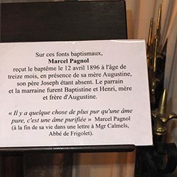 A l'entrée du Palais de la Bourse nous ne manquerons pas de faire une halte devant une Turcat-Mery de 1927, voiture construite à Marseille et qui fut la première automobile achetée par l'immense acteur qu'était Jules Raimu, créateur du rôle de César alors que Marcel Pagnol voulait lui faire endosser celui de Panisse. Nos pas nous mèneront alors vers l'église Saint-Charles dont les fonds baptismaux ont accueilli un candidat que l'on pourrait qualifier de clandestin : le petit Marcel Pagnol baptisé par sa mère en cachette de Joseph le père instituteur anticlérical intransigeant ! Le fait y est rappelé par un écriteau placé à côté de la cuve baptismale.